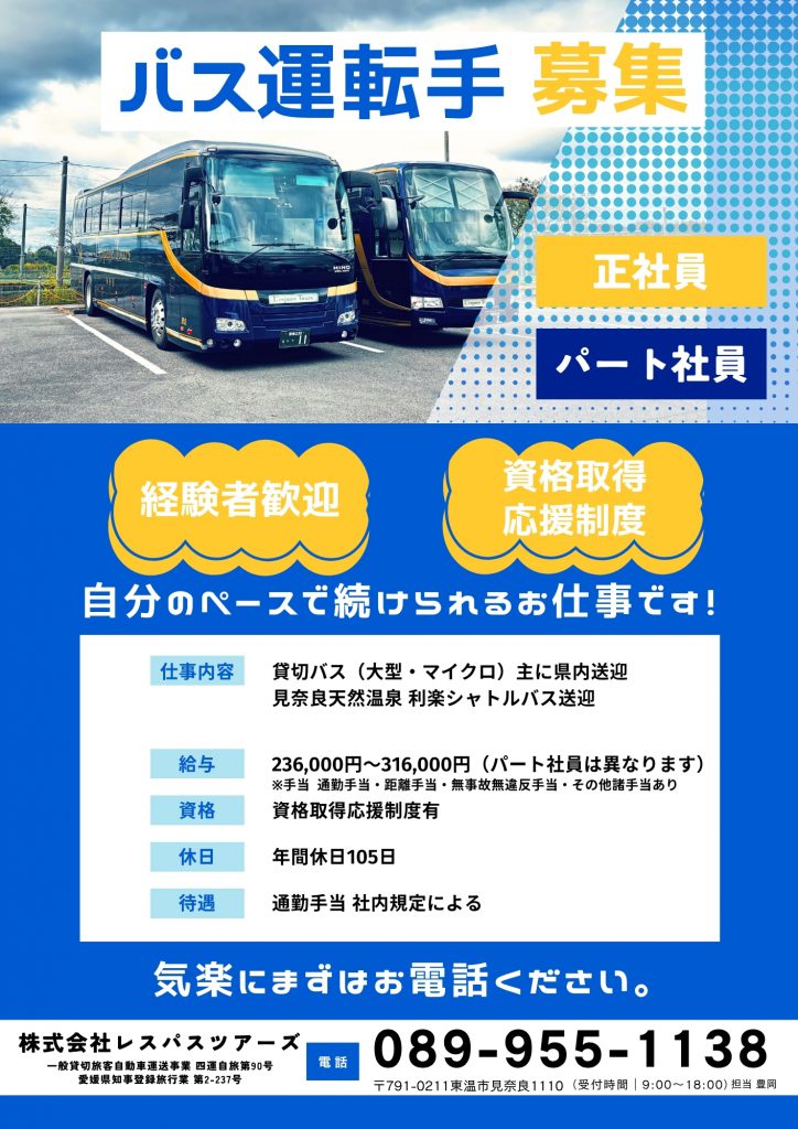 バス運転手 大募集 Home / バス運転手 大募集 バス運転手 大募集 2025年12月22日お知らせ, クールス・モール, 催事・イベント お知らせ いしづち山麓マルシェ 周年祭2026 (2026年4月19日) 2009年初演『鶴姫伝説』で鶴姫役を務めた碓井涼子さんの期間限定出演が決定 (2026年4月13日) 4/26フリマ開催のご案内 (2026年4月13日) とうおんフェス開催 (2026年4月11日) 「河内晩柑フェア」のお知らせ (2026年4月6日) >>お知らせ一覧サイト内検索 Search for: