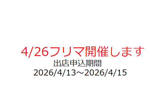 4/26フリマ開催のご案内 Home / 4/26フリマ開催のご案内 4/26フリマ開催のご案内 2026年4月13日お知らせ, クールス・モール, 催事・イベント お知らせ いしづち山麓マルシェ 周年祭2026 (2026年4月19日) 2009年初演『鶴姫伝説』で鶴姫役を務めた碓井涼子さんの期間限定出演が決定 (2026年4月13日) 4/26フリマ開催のご案内 (2026年4月13日) とうおんフェス開催 (2026年4月11日) 「河内晩柑フェア」のお知らせ (2026年4月6日) >>お知らせ一覧サイト内検索 Search for: